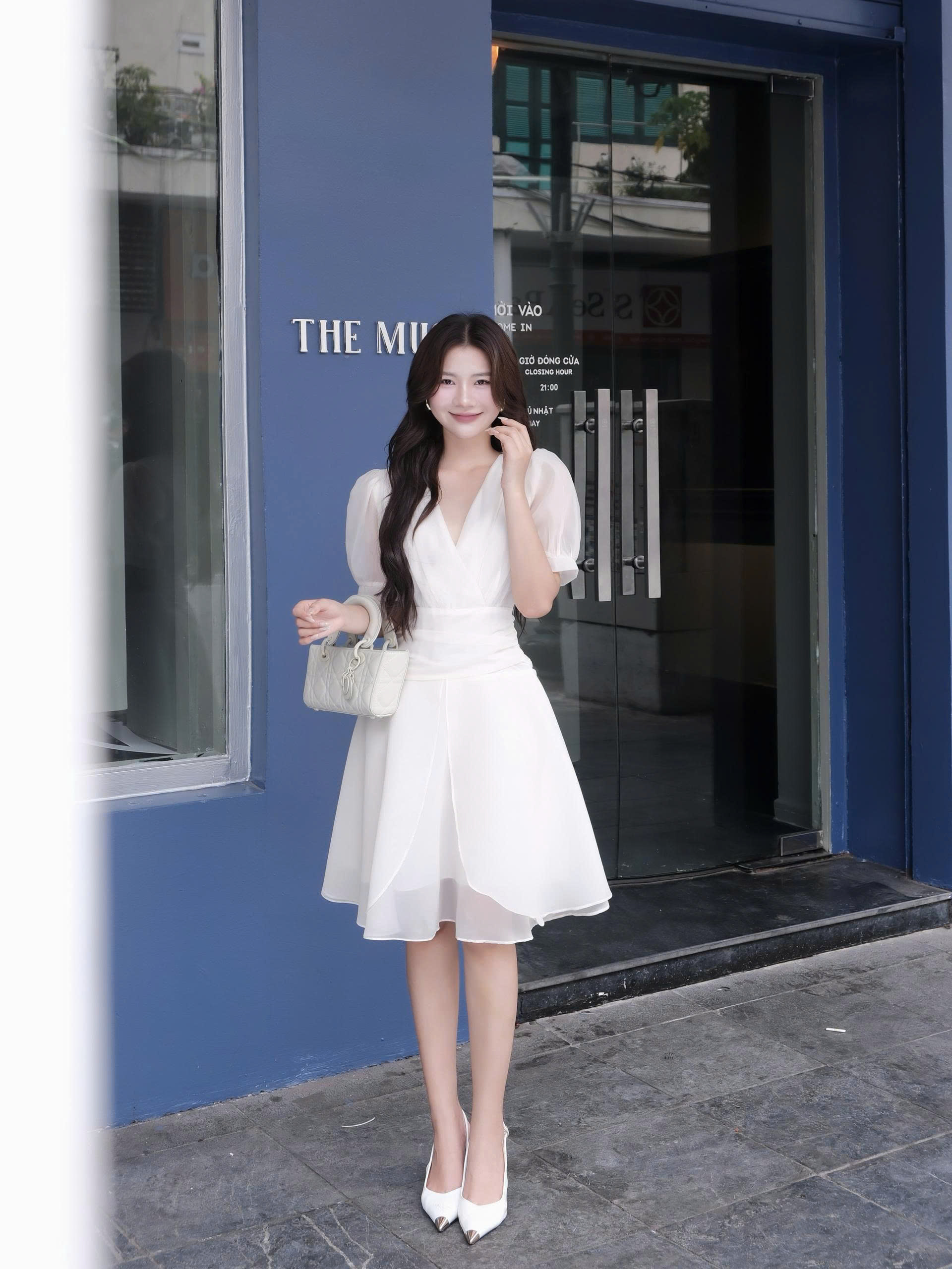 Chiếc đầm màu Be pastel với thiết kế cổ V thanh thoát, phần eo được xử lý tinh tế giúp tôn dáng tự nhiên, kết hợp cùng dáng váy xòe nhẹ tạo cảm giác bay bổng và nữ tính