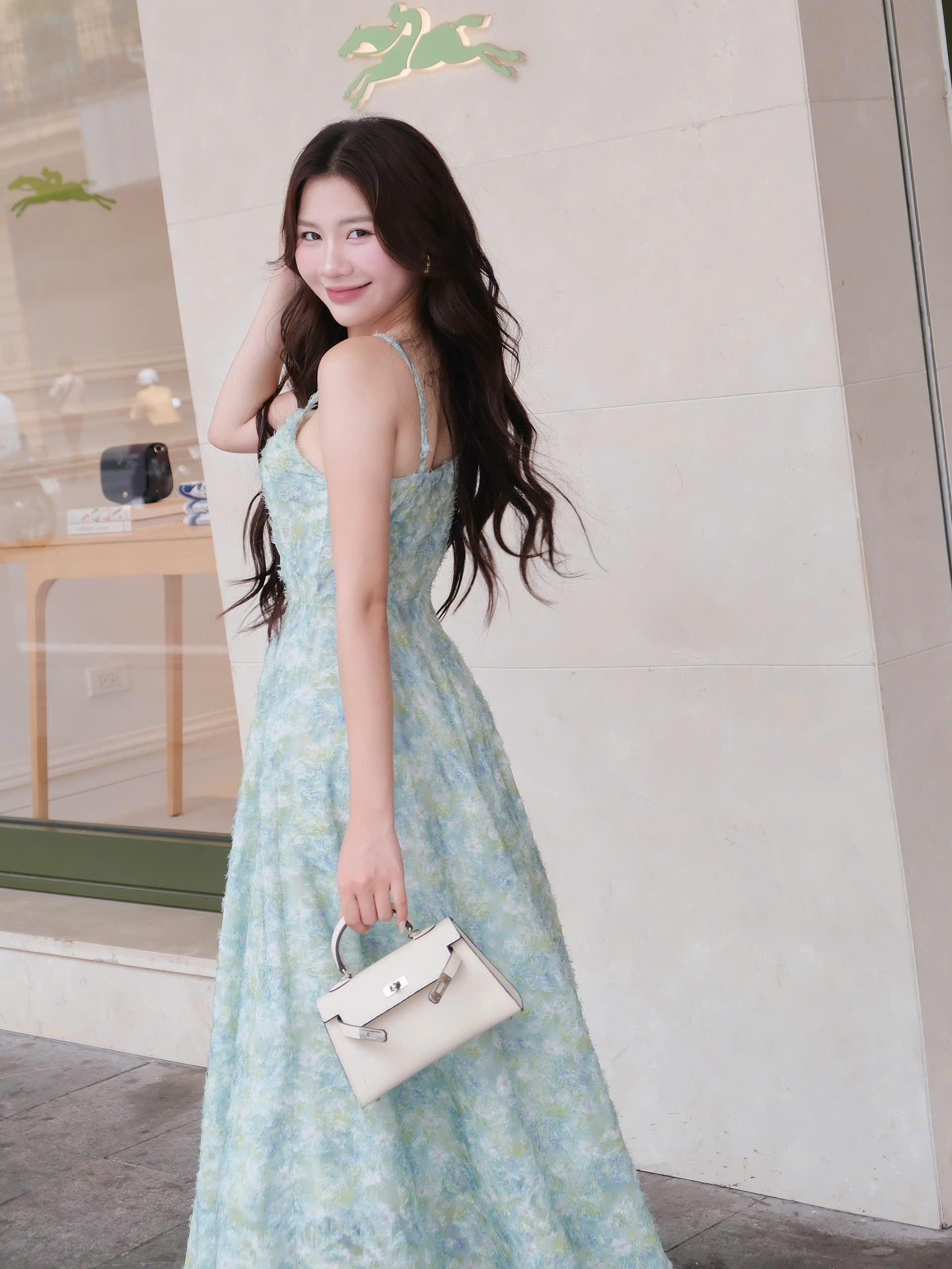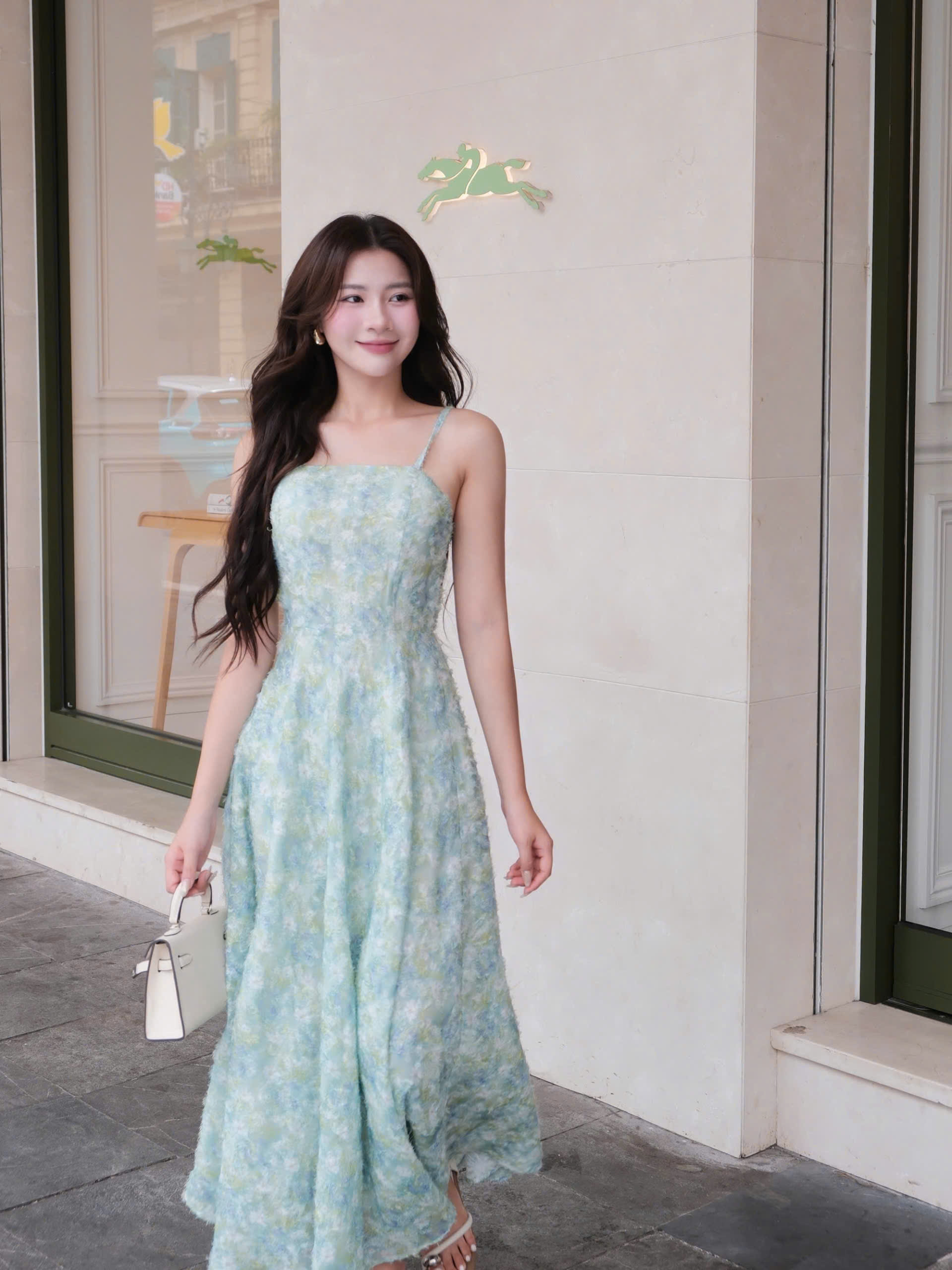 Thiết kế váy maxi hai dây với gam xanh pastel loang nhẹ, tạo cảm giác mát mắt và cực kỳ “chill”. Form dáng ôm nhẹ phần thân trên, xòe mềm ở chân váy giúp tôn dáng và tạo chuyển động bay bổng khi bước đi.