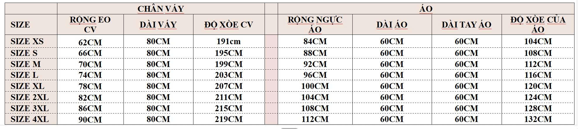 BẢNG SIZE :