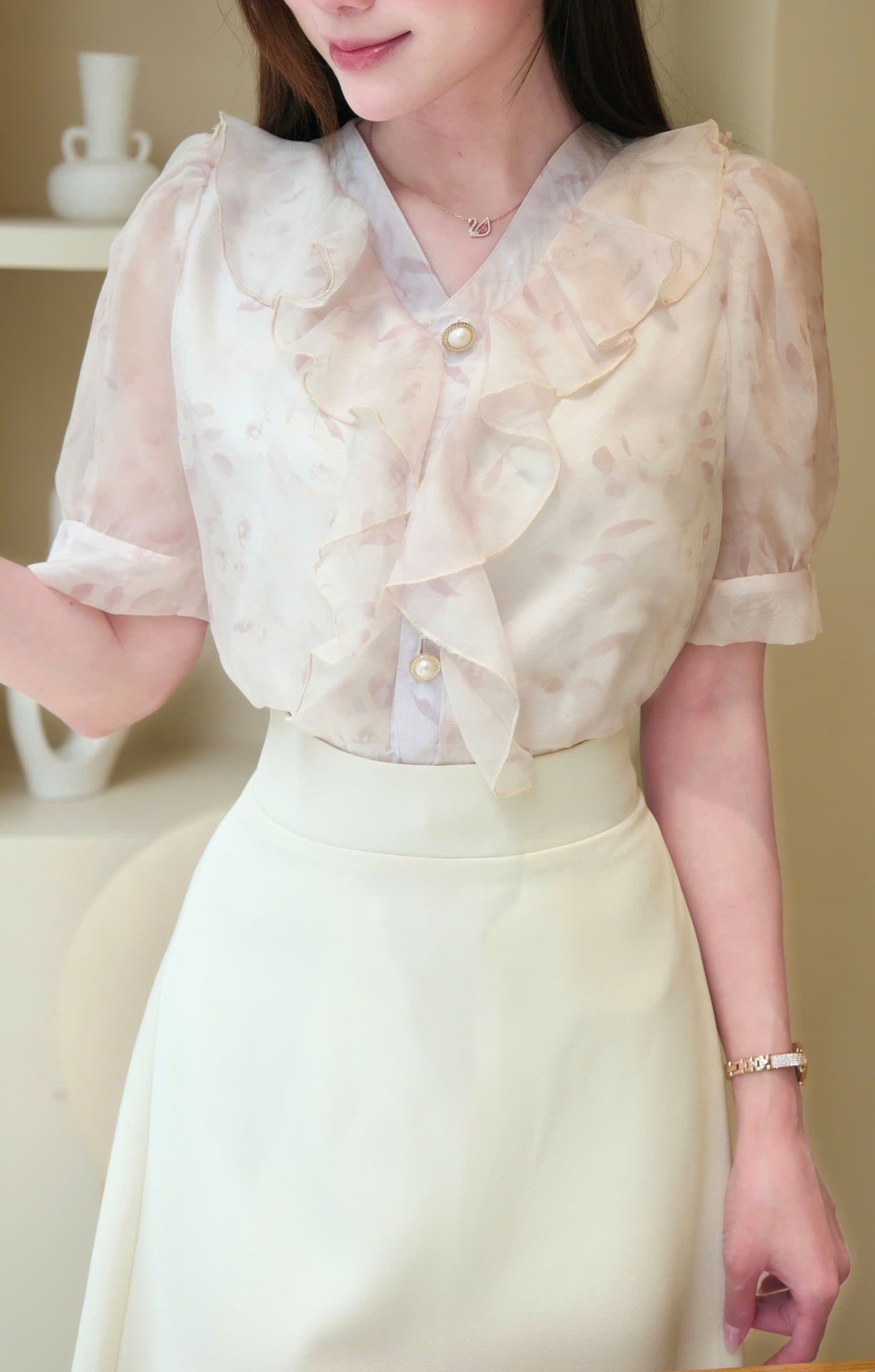 Thiết kế áo voan nhẹ nhàng với chi tiết bèo mềm mại ở phần cổ và thân áo, tạo cảm giác dịu dàng và thanh lịch.